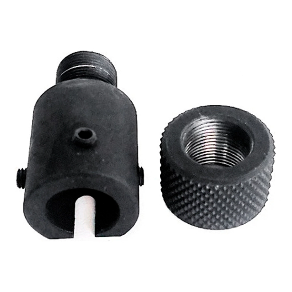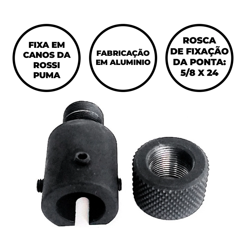O adaptador com rosca para Puma 38 Rossi é uma peça de alumínio com dimensões de 25mm x 50mm. Ele vem com uma tampa protetora e é fixado em canos da Rossi Puma com 3 parafusos Allen. A rosca de fixação da ponta é de 5/8x24 UNF.