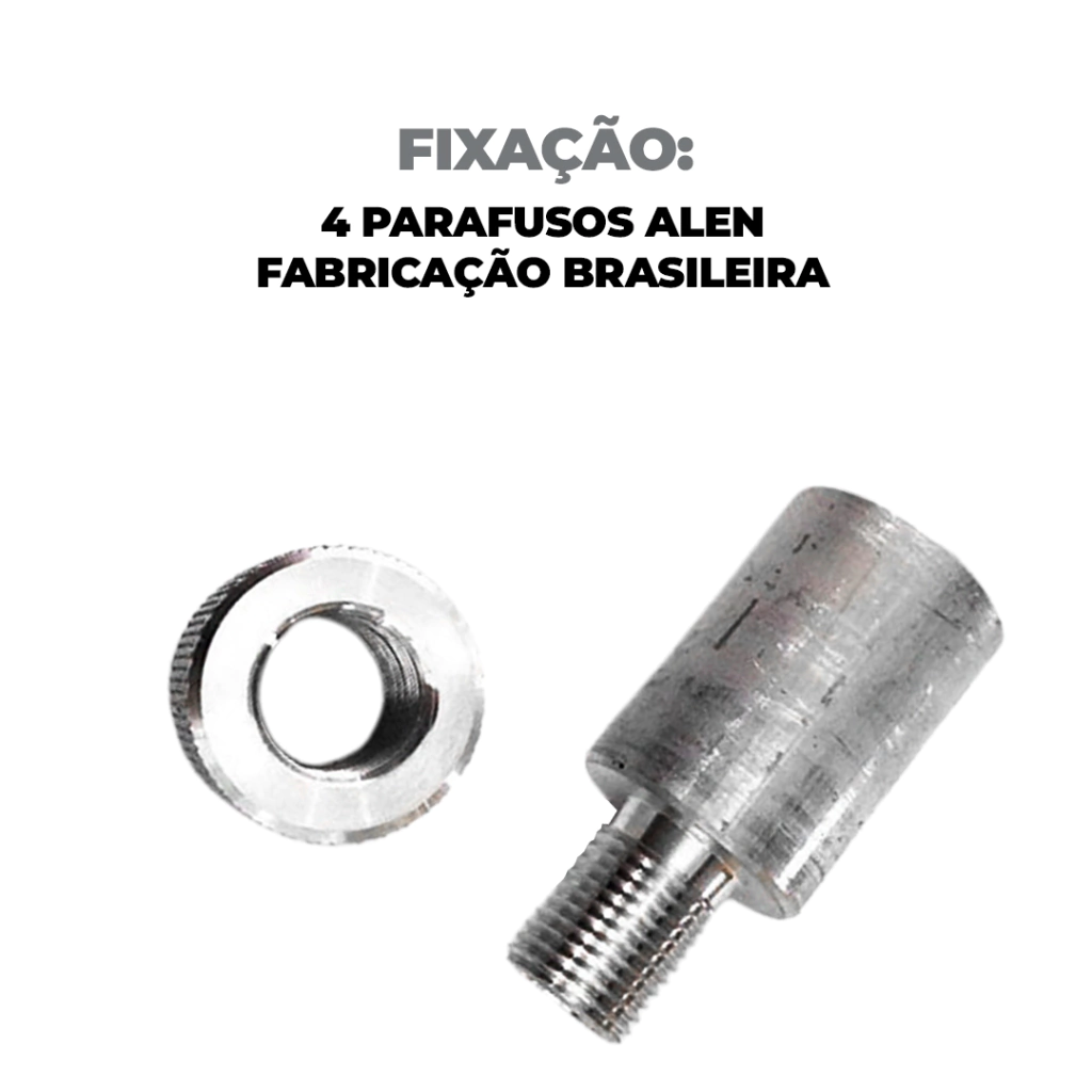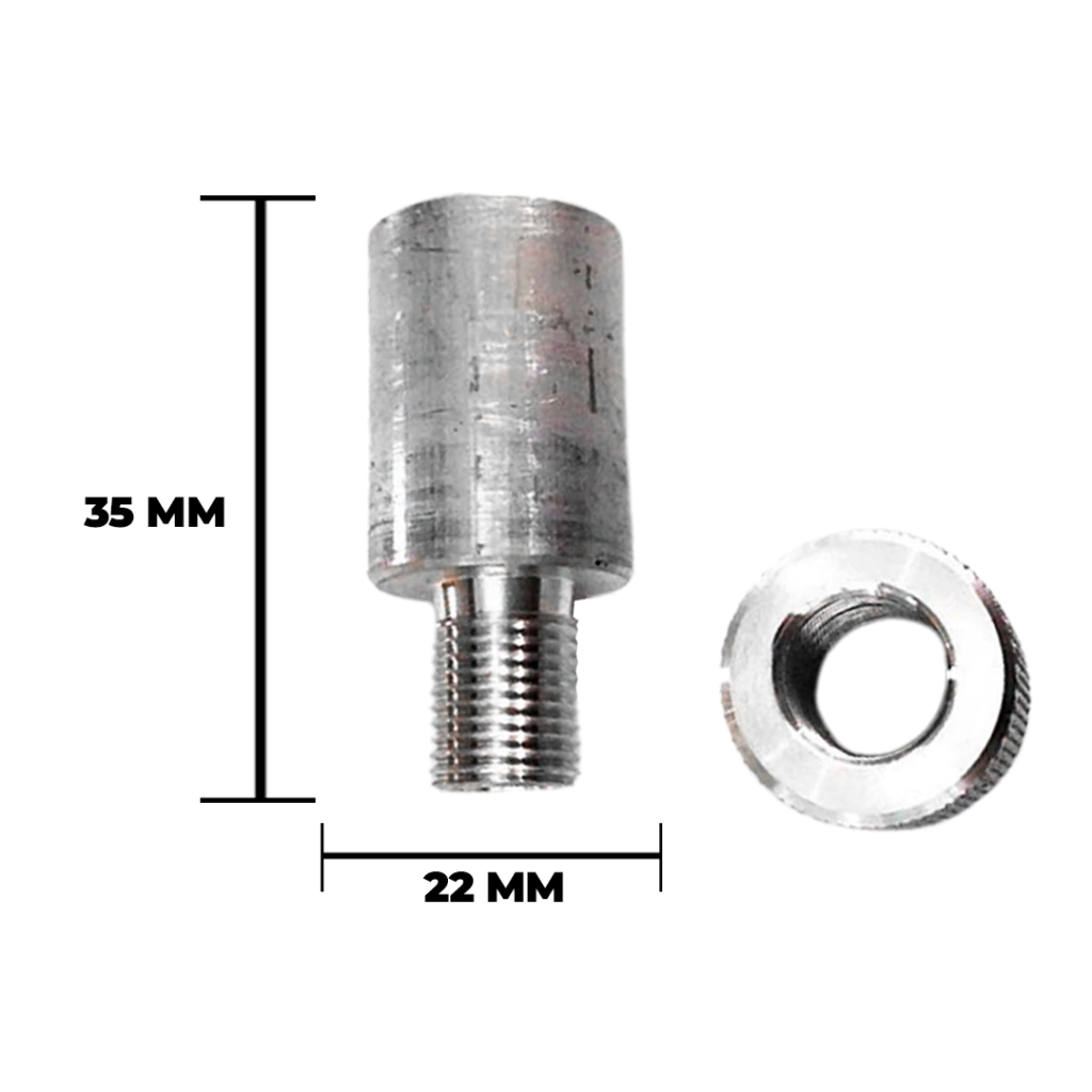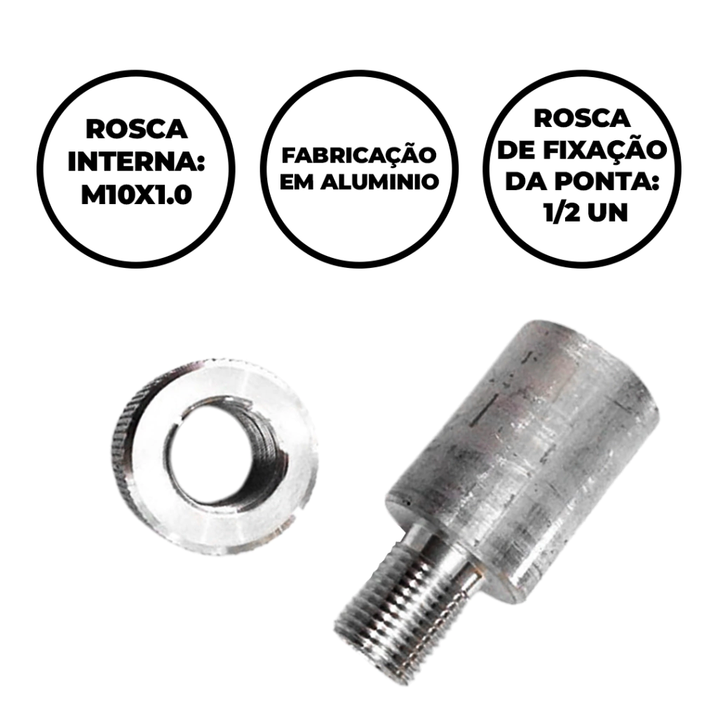 O adaptador com entrada de rosca M10x1.0 e saída de 1/2x20 UNF em alumínio é uma peça de alumínio com dimensões de 22mm x 35mm. Ele vem com uma tampa protetora sendo fixado com 4 parafusos Allen. A rosca de fixação da ponta é de 1/2 UNF e a rosca interna é de M10x1.0