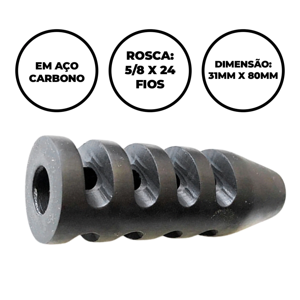 O compensador é projetado para reduzir o recuo e o levantamento do cano durante o disparo. Fabricado em aço carbono 4140 com acabamento oxidado. Possui um comprimento de 80 mm e um diâmetro de 31 mm.