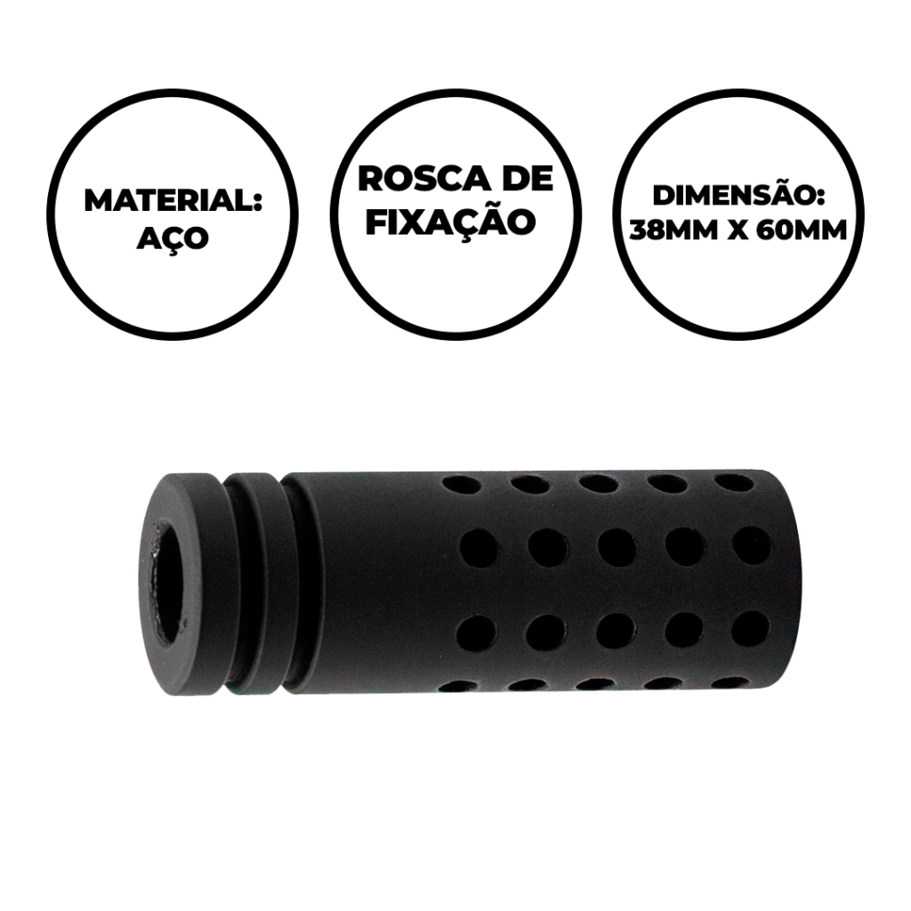 O compensador é projetado para reduzir o recuo e o levantamento do cano durante o disparo. Fabricado em aço carbono 4140 com acabamento oxidado. Possui um comprimento de 60 mm e um diâmetro de 38 mm.
