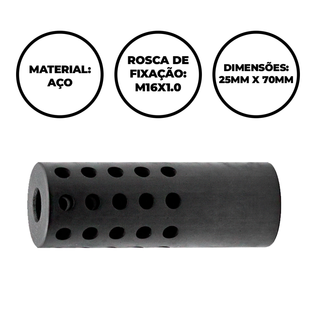 O compensador é projetado para reduzir o recuo e o levantamento do cano durante o disparo. Fabricado em aço carbono 4140 com acabamento oxidado. Possui um comprimento de 70 mm e um diâmetro de 25 mm.