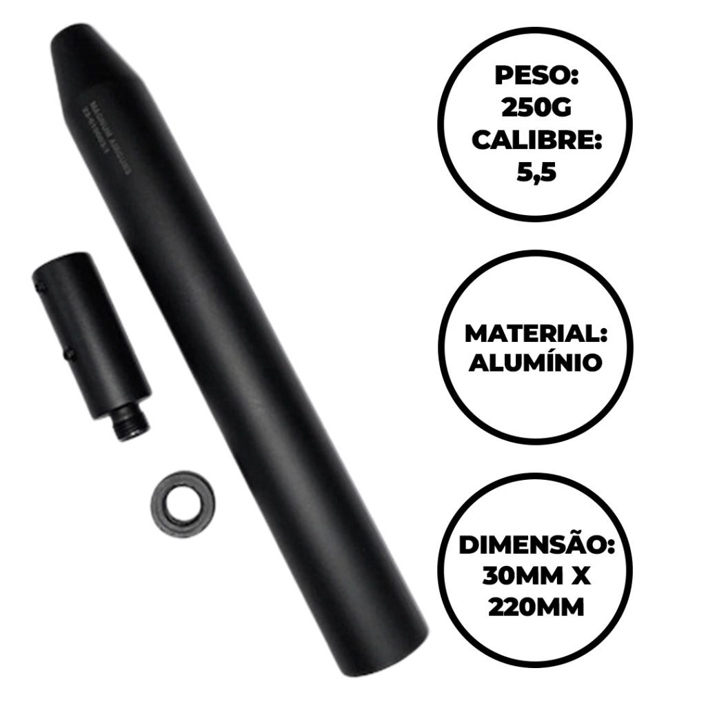 O Supressor De Ar Com Adaptador (diâmetro 16mm), não apenas proporciona um visual elegante, mas também oferece benefícios práticos, aprimorando sua experiência de tiro, elevando o desempenho da sua carabina de ar comprimido.